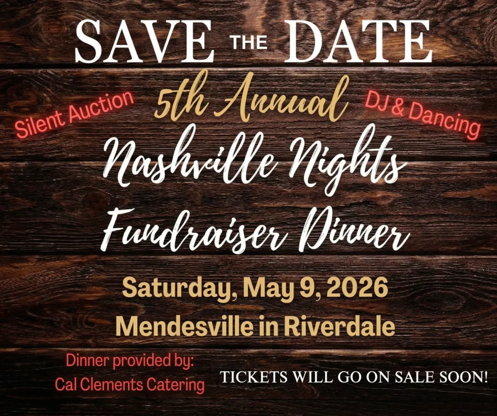 Join us on Saturday, May 9, 2026, for our Annual Fundraiser Dinner in Mendesville in Riverdale. This year’s Nashville Nights theme will include dinner by Cal Clements Catering, a silent auction, and DJ and dancing. More details and ticket information coming soon.